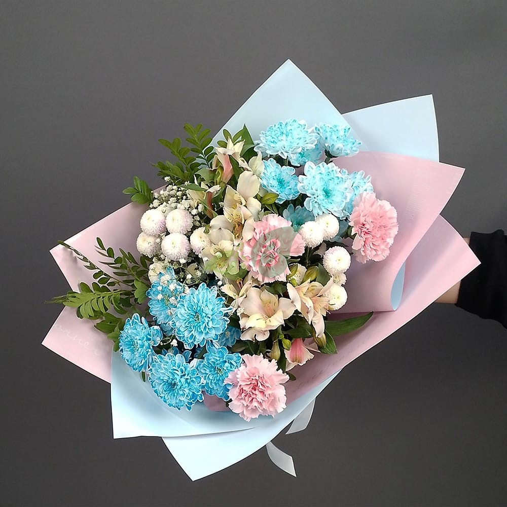 Сочетание голубого, белого и розового цветов замечательно подойдет для подарка как девушке, так и мужчине. Такой букет можно подарить и на выписку из роддома, и на свадьбу молодым.